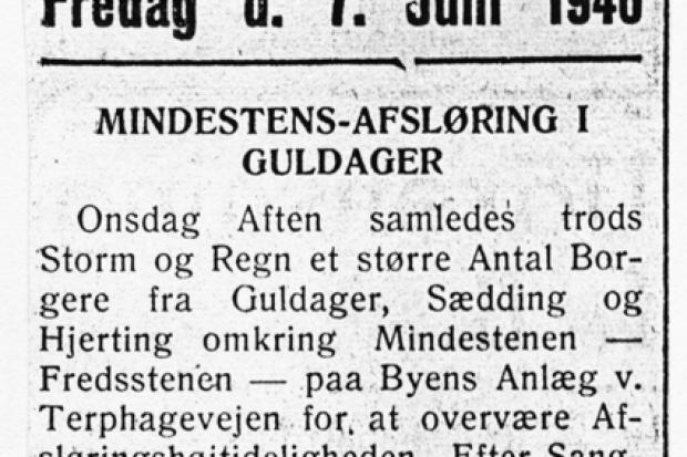 Umiddelbart efter Besættelsen opstod ideen om at rejse en fredssten på Borgerjorden. I regnskabsbogen kan man se de udgifter, der var forbundet med dette. Falck skulle have 55 kr. for transport af stenen, og stenhuggerfirmaet Billeschou 326 kr. I mappen med de gamle udklip fra »Vestkysten fandt vi referatet fra højtideligheden, hvor stenen blev afsløret. Som det fremgår af referatet havde borgerforeningen fået landmand og forfatter Salomon Frifeldt fra Ølgod til at holde talen. Han var en af den tids meget skattede forfattere og opnåede at komme på finansloven. Han døde i 1973 og ligger begravet på Begsnap Kirkegård. Der er rejst en mindesten for ham på en samlingsplads i Hejbøl Plantage.